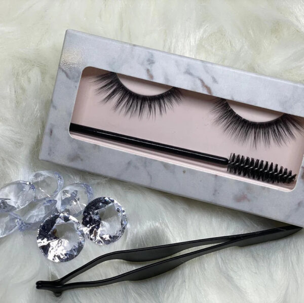 This luxurious false eyelash set features a pair of voluminous, wispy lashes designed to enhance any eye shape with a dramatic yet natural look. The set includes a spoolie brush for easy grooming and a sleek black applicator tool for precise placement.
